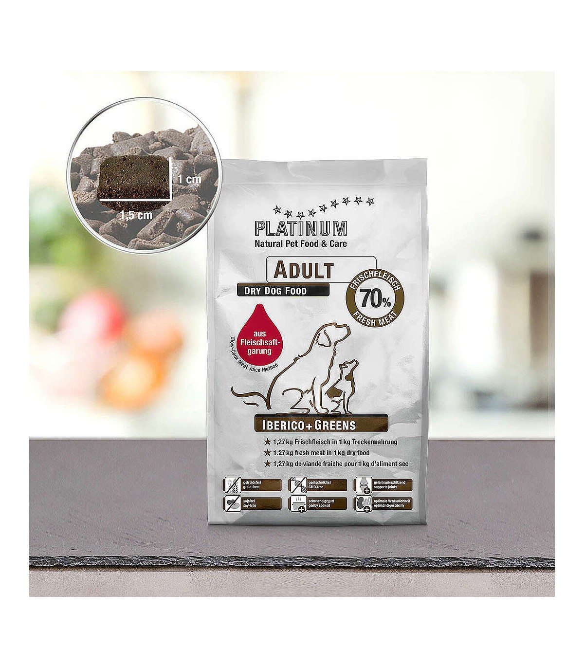 Carne fresca di maiale (70 % esclusivamente di maiale iberico), patate essiccate, pesce essiccato, lievito di birra essiccato, polpa di mela essiccata, olio di salmone, estratto di yucca, olio di semi di lino a spremitura a freddo, olio di oliva a spremitura a freddo, estratto di cozza verde, carote essiccate, pomodori essiccati, calendula africana essiccata, dente di leone essiccato, broccoli essiccati, tè verde essiccato, camomilla essiccata, origano essiccato, semi di cardo mariano essiccato, semi di mirtillo rosso essiccati, alghe essiccate, cloruro di potassio.
