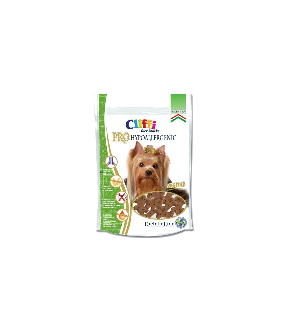 CLIFFI "PRO-HYPOALLERGENIC VEGETAL" riduce il rischio di intolleranze alimentari essendo formulato con una fonte di proteine vegetali ad alta tollerabilità, derivata dalla soia. Non contiene cereali e ingredienti di origine animale aggiunti, che possono essere causa di intolleranze; nella sua preparazione non vengono aggiunti coloranti, conservanti e aromi artificiali. È la ricompensa ideale fra i pasti.