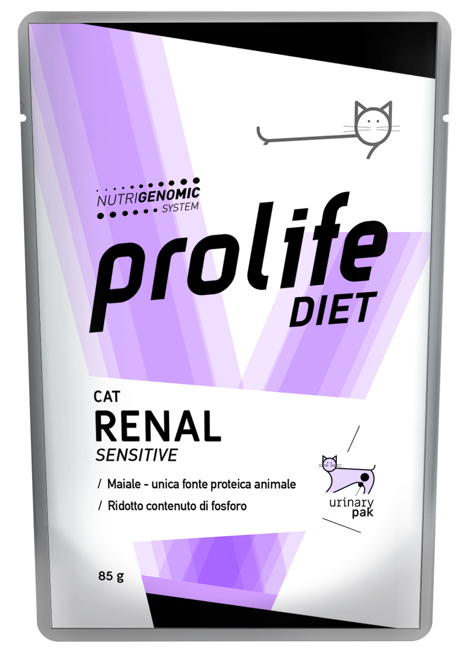 Alimento completo dietetico per il gatto formulato per il supporto alla funzione renale in caso di insufficienza renale cronica o temporanea. Monoproteico al gusto Maiale