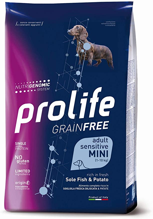 Prolife Dry Dog Grain Free Sensitive Adult Mini Cane Sogliola e Patate 2 Kg è un alimento grain Free per cani di Piccola taglia affetti da problemi di ipersensibilità. E' un alimento completo ricco di Sogliola Fresca diliscata e Patate per il cane adulto sensibile di taglia piccola dai 12 mesi.