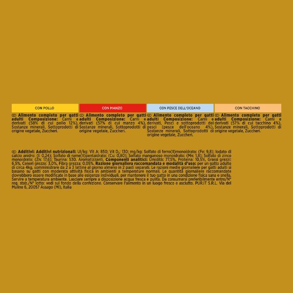 Razione giornaliera e modalità d'uso: per un gatto adulto di circa 4 kg, somministrare 3 lattine al giorno in almeno 2 pasti separati. Le quantità giornaliere raccomandate dovrebbero essere modificate in base alle esigenze individuali, per mantenere il tuo gatto in una condizione fisica sana e snella. Per gatte in gestazione o in allattamento, servire il prodotto a volontà. Servire a temperatura ambiente. Lasciare sempre a disposizione acqua fresca e pulita.