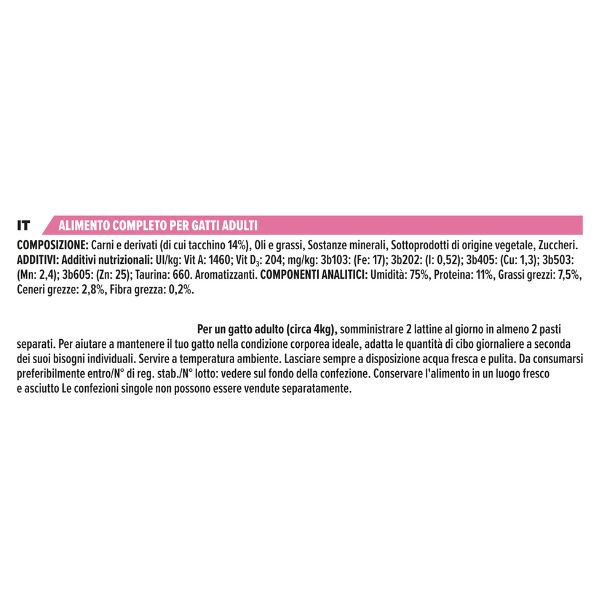 Composizione: Carni e derivati (di cui tacchino 14%), Oli e grassi, Sostanze minerali, Sottoprodotti di origine vegetale, Zuccheri.