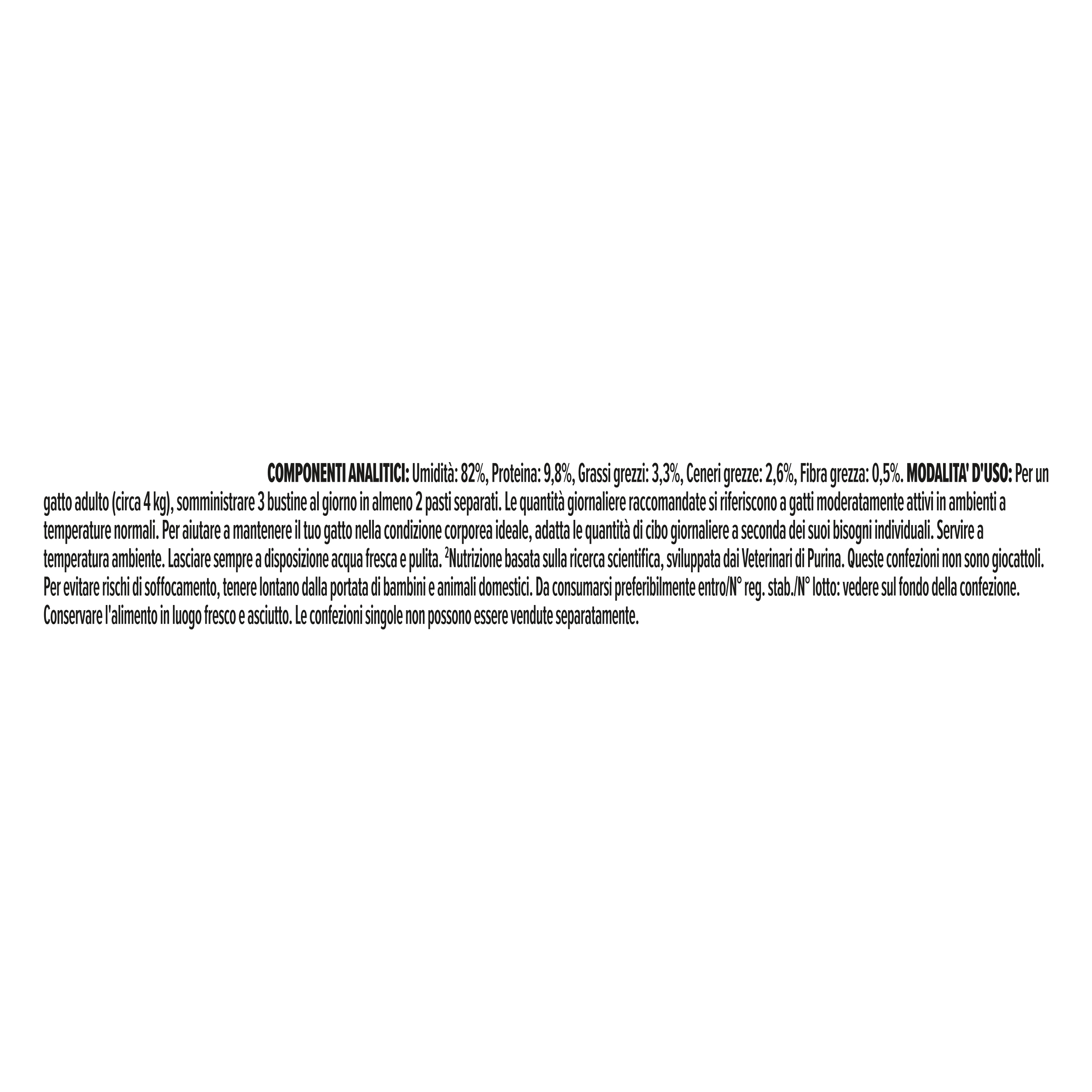 ISTRUZIONI D'USO: Per un gatto adulto (circa 4 kg), somministrare 2½ buste al giorno in almeno 2 pasti separati. Le quantità giornaliere raccomandate si pubblicano a gatti moderatamente attivi in ambienti a temperatura normale. Per aiutare a mantenere il tuo gatto nella condizione corporea ideale, adattare la quantità di cibo giornaliero a seconda dei suoi bisogni individuali. Servire a temperatura ambiente. Lasciare sempre a disposizione acqua fresca e pulita. Per un gatto adulto (circa 4 kg), somministrare 2½ buste al giorno in almeno 2 pasti separati. Per aiutare a mantenere il tuo gatto nella condizione corporea ideale, adatta la quantità di cibo giornaliero a seconda dei suoi bisogni individuali. Servire a temperatura ambiente. Lasciare sempre a disposizione acqua fresca e pulita.