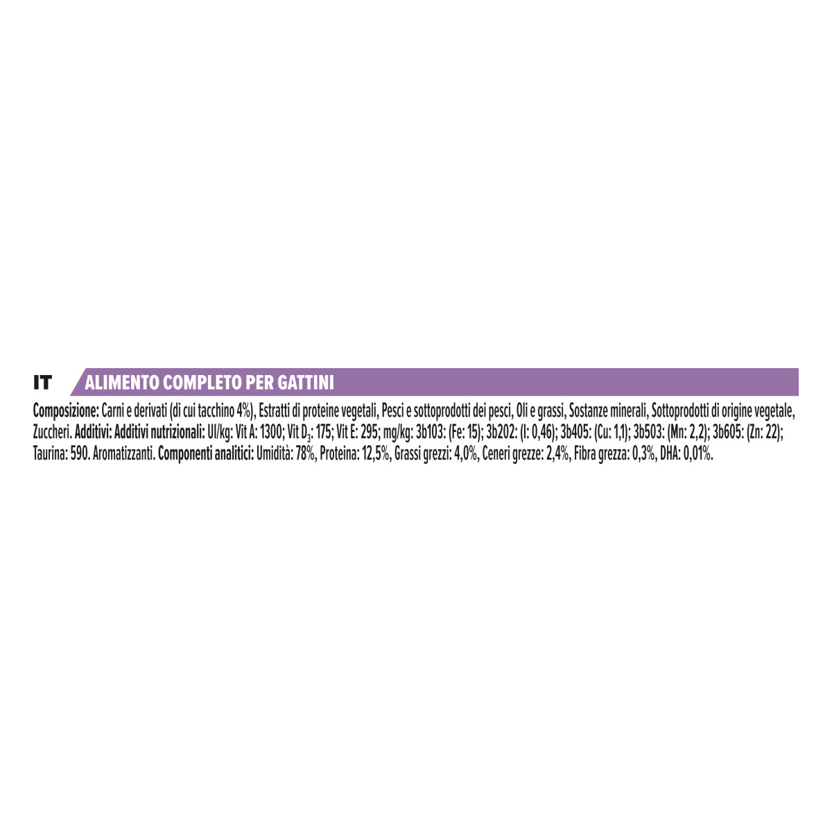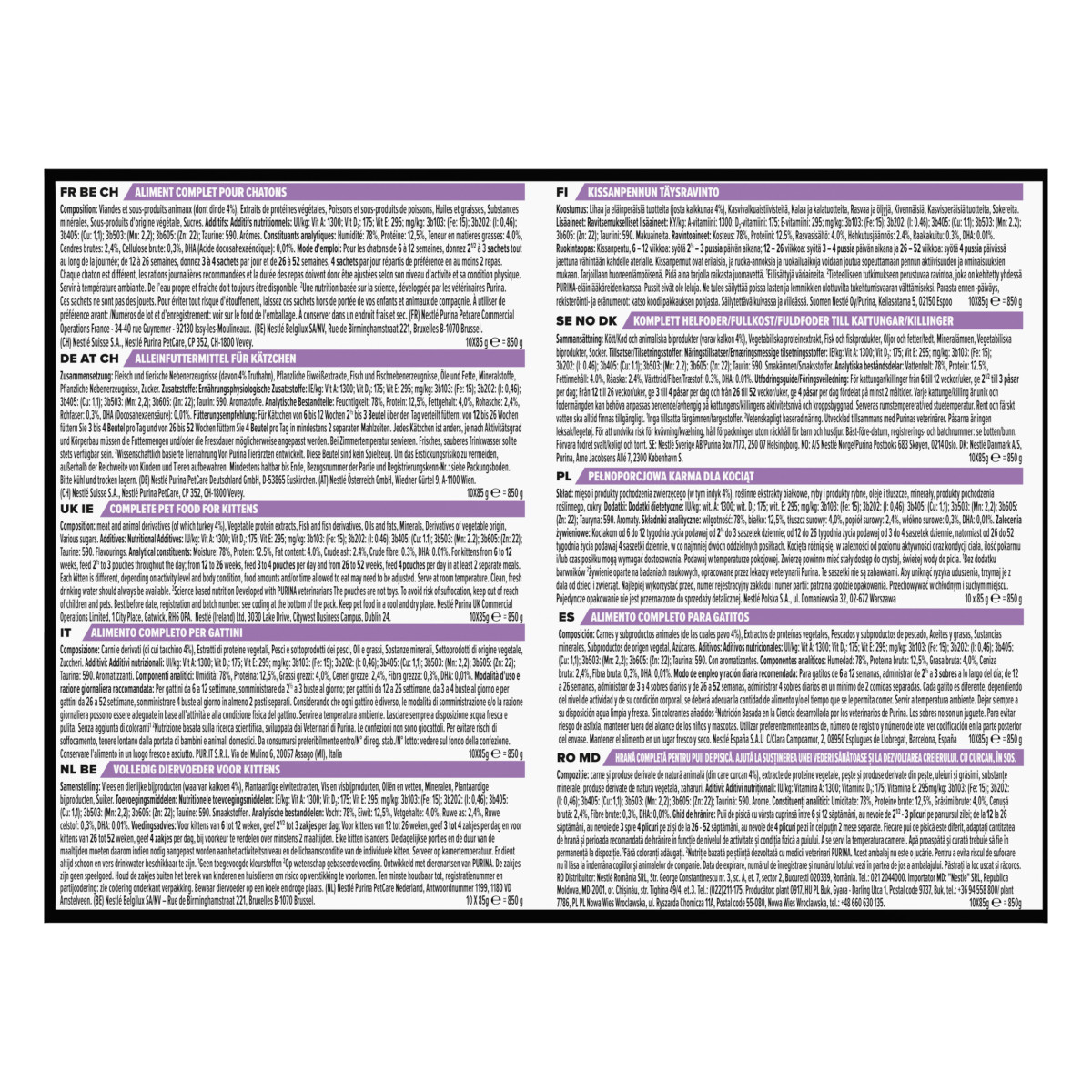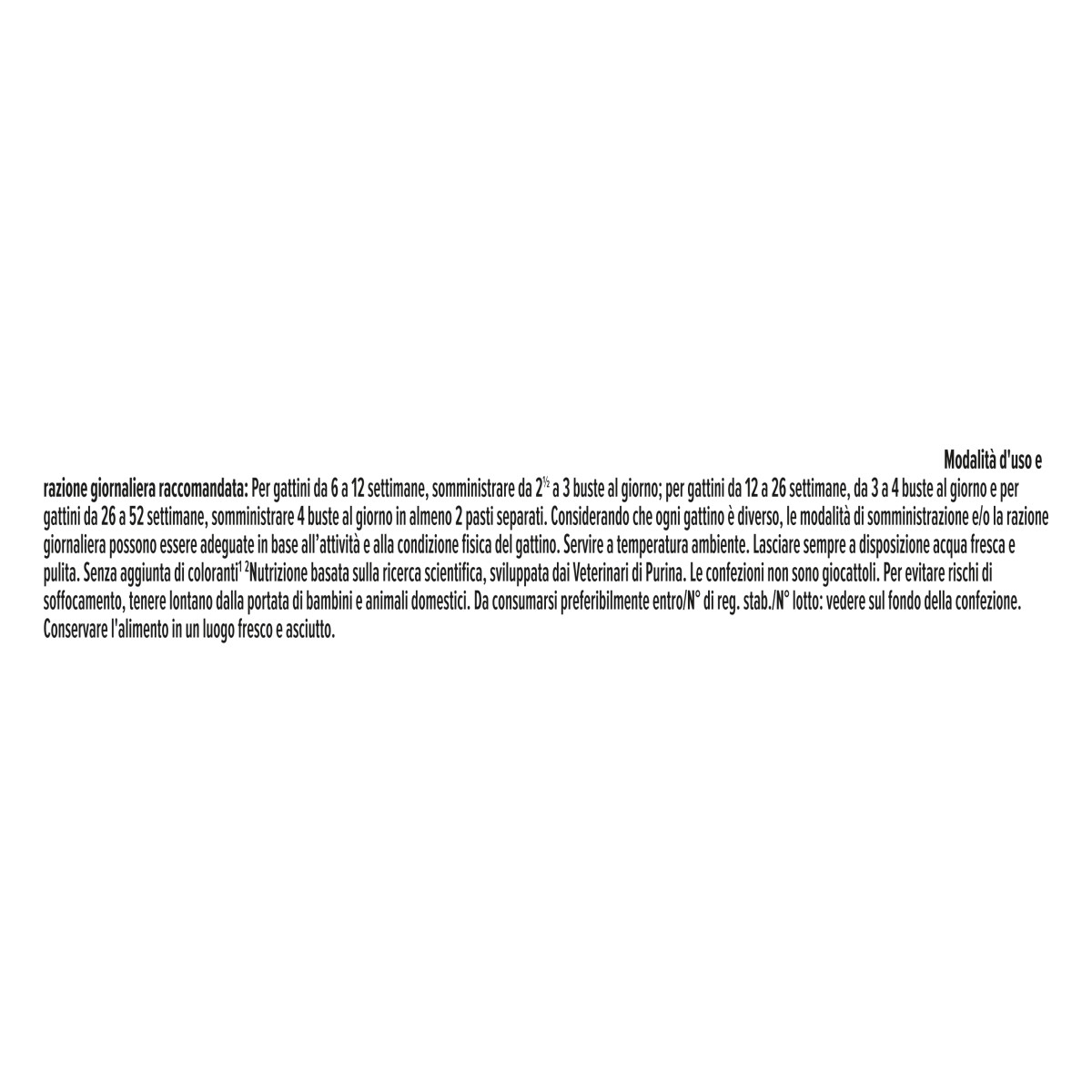 Razione giornaliera raccomandata: per gattini da 6 a 12 settimane, somministrare da 2,5 a 3 buste al giorno; per gattini da 12 a 26 settimane, da 3 a 4 buste al giorno e per gattini da 26 a 52 settimane, somministrare 4 buste al giorno in almeno 2 pasti separati. Considerando che ogni gattino è diverso, le modalità di somministrazione e/o la razione giornaliera possono essere adeguate in base all’attività e alla condizione fisica del gattino. Lasciare sempre a disposizione acqua fresca e pulita.