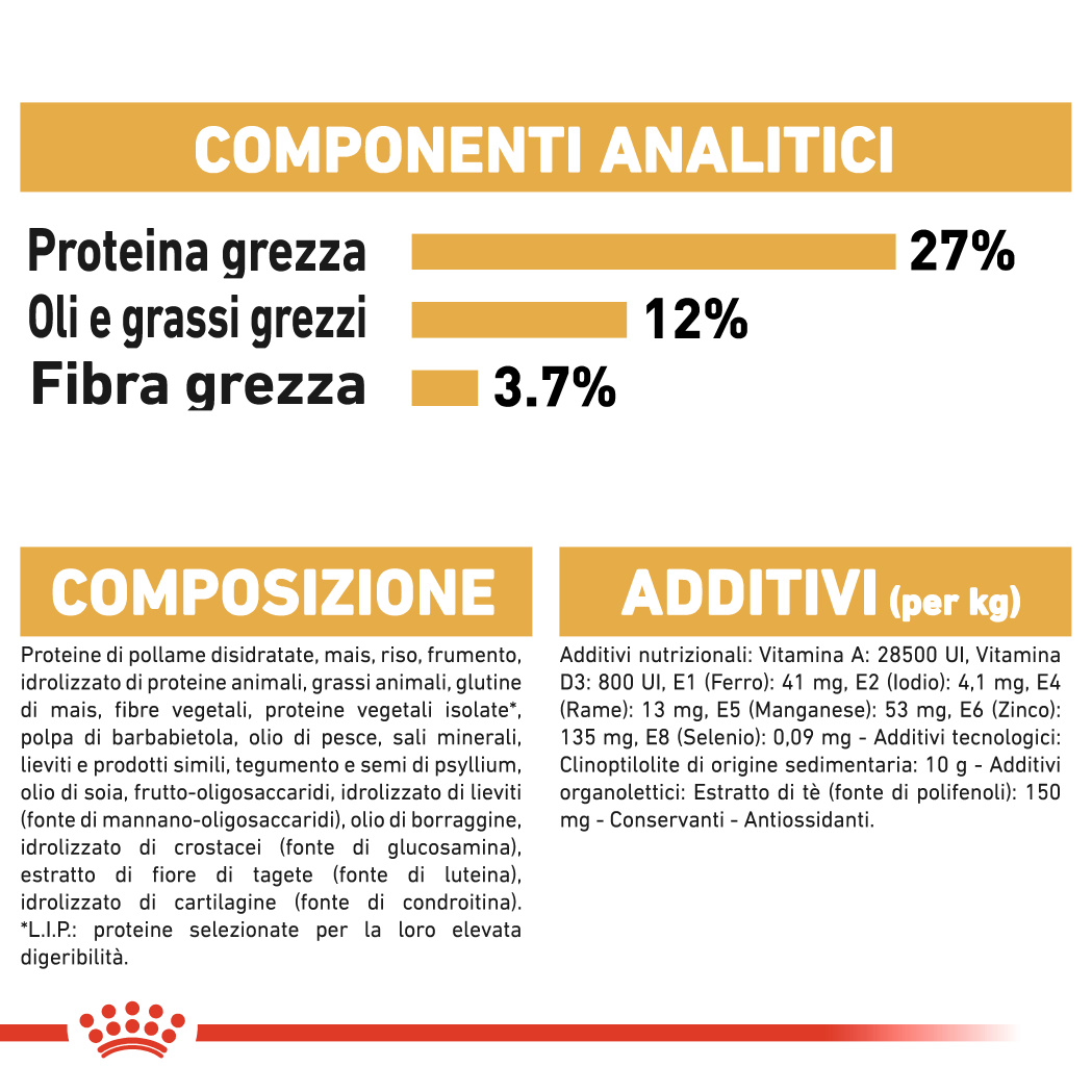 Ingredienti: proteina del pollame disidratata, mais, riso, frumento, grassi animali, glutine del mais, proteine animali idrolizzate, fibre vegetali, isolato di proteine vegetali *, polpa di barbabietola, minerali, olio di pesce, lieviti, olio di soia, semi di psyllium, frutto-oligosaccaridi, lievito idrolizzato (fonte di manno-oligosaccaride), olio di borragine, vinacciuoli ed estratto di t? verde (fonte di polifenolo), idrolizzato di crostacei (fonte di glucosamina), estratto di calendula (ricco di luteina), idrolizzato di cartilagine (fonte di condroitina). *L.I.P.: a basso contenuto di proteine indigeribili.