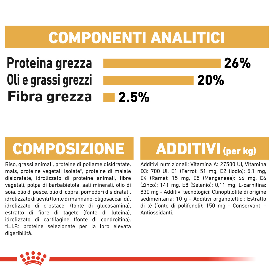 Ingredienti: riso, grassi animali, proteine di pollame disidratate, mais, proteine vegetali isolate*, proteine di maiale disidratate, idrolizzato di proteine animali, sali minerali, lignocellulosa, polpa di barbabietola, olio di soia, olio di pesce, pomodori disidratati, olio di copra, idrolizzato di lieviti (fonte di mannano-oligosaccaridi), idrolizzato di crostacei (fonte di glucosamina), estratto di fiore di Tagete (fonte di luteina), estratti di tè verde e di vinacce (fonte di polifenoli), idrolizzato di cartilagine (fonte di condroitina).