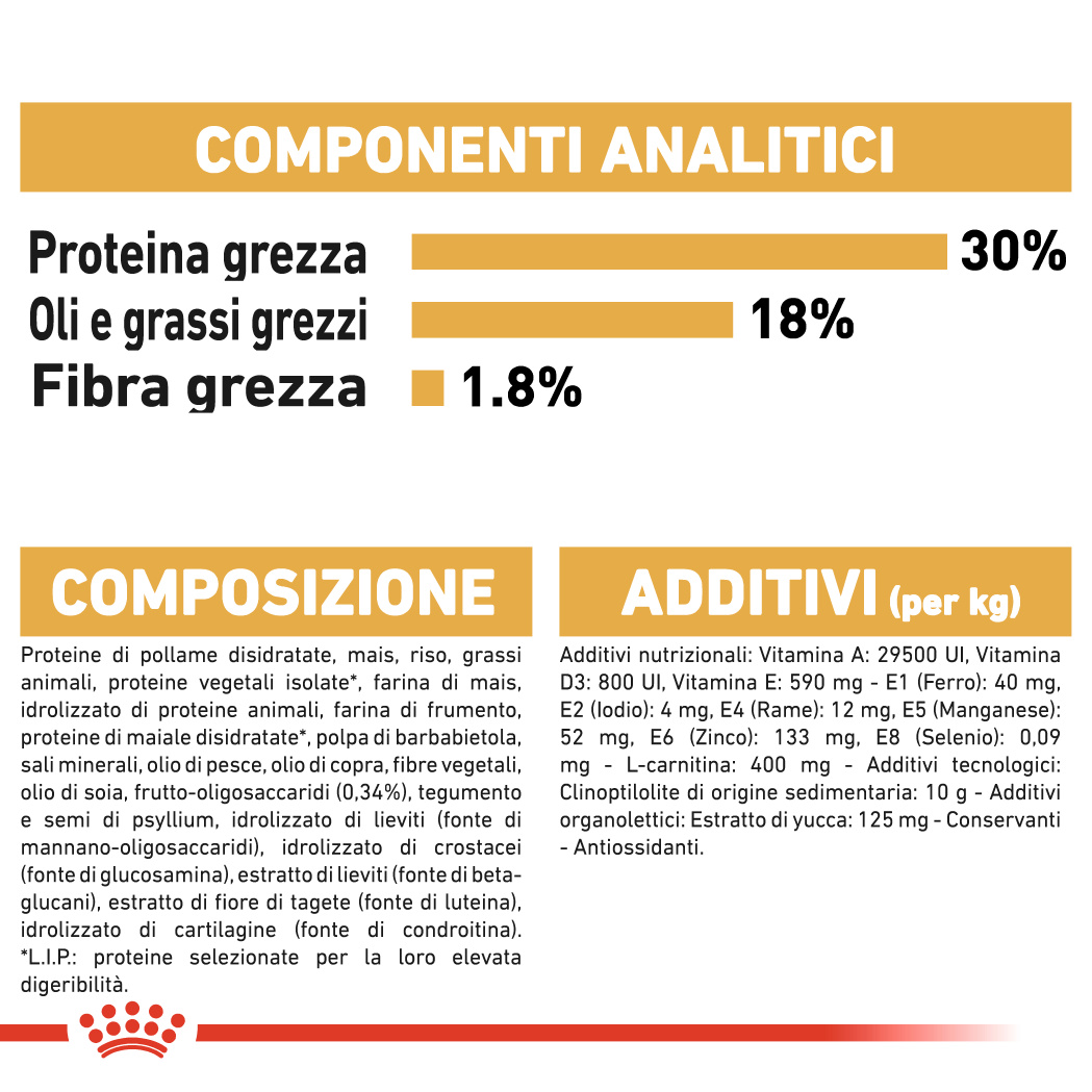 proteine del pollame (disidratate), riso, mais, grasso di origine animale, isolato di proteine vegetali*, proteine di maiale (disidratate), proteine di origine animale (idrolizzato), olio di soia, olio di copra, olio di soia, fettine di barbabietola disidratata, minerali, fibre vegetali, frutto-oligosaccaridi, idrolizzato di lievito (ricco di mannano-oligosaccaridi), Psyllium (semi e tegumenti), frutto-oligosaccaridi, idrolizzato di crostacei (ricco di glucosammina), estratto di fiore di Tagetes (ricco di luteina), L-carnitina, idrolizzato di cartilagine (ricco di condroitina).