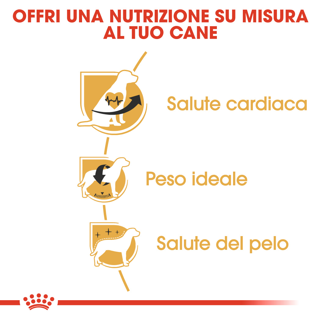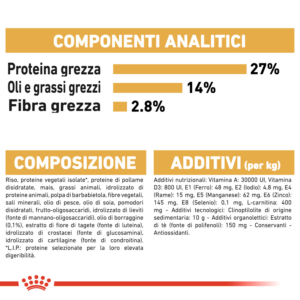 Ingredienti: riso, proteina del pollame (disidratata), isolato di proteina vegetale*, mais, grasso animale, proteina animale (idrolizzata), fibre vegetali, polpa di barbabietola essiccata, minerali, olio di pesce, olio di soia, pomodori essiccati, frutto-oligosaccaridi, idrolizzato di lievito (fonte di mannano-oligosaccaridi), olio di borragine (0,1%), uovo in polvere, vinaccioli e tè verde (fonte di polifenoli), idrolizzato di crostacei (fonte di glucosamina), estratto di fiori di tagetes (fonte di luteina), cartilagine idrolizzata (fonte di condroitina).