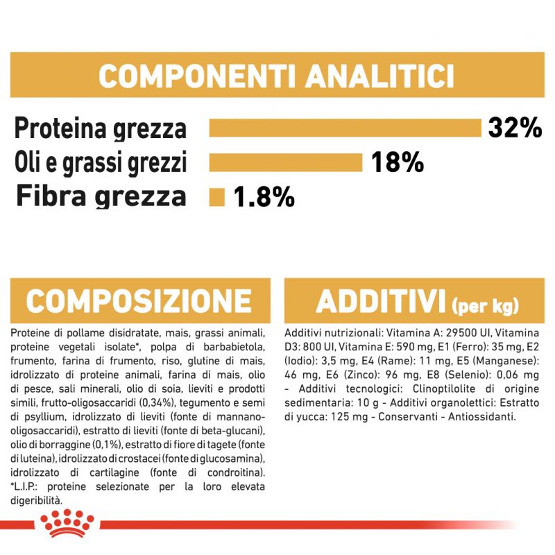Componenti:proteine di pollame (disidratate), mais, grassi animali, proteine vegetali isolate*, polpa di barbabietola, frumento, farina di frumento, riso, glutine del mais, idrolizzato di proteine animali, farina di mais, olio di pesce, minerali, olio di soia, lieviti e parti del lievito, frutto-oligosaccaridi (0,34 %), psillio (tegumento e semi), idrolizzato di lieviti (fonte di mannano-oligosaccaridi), estratti di lievito (fonte di betaglucani), olio di borragine (0,1%), estratto di fiori di Tagete (fonte di luteina), idrolizzato di crostacei (fonte di glucosamina), idrolizzato di cartilagine (fonte di condroitina).