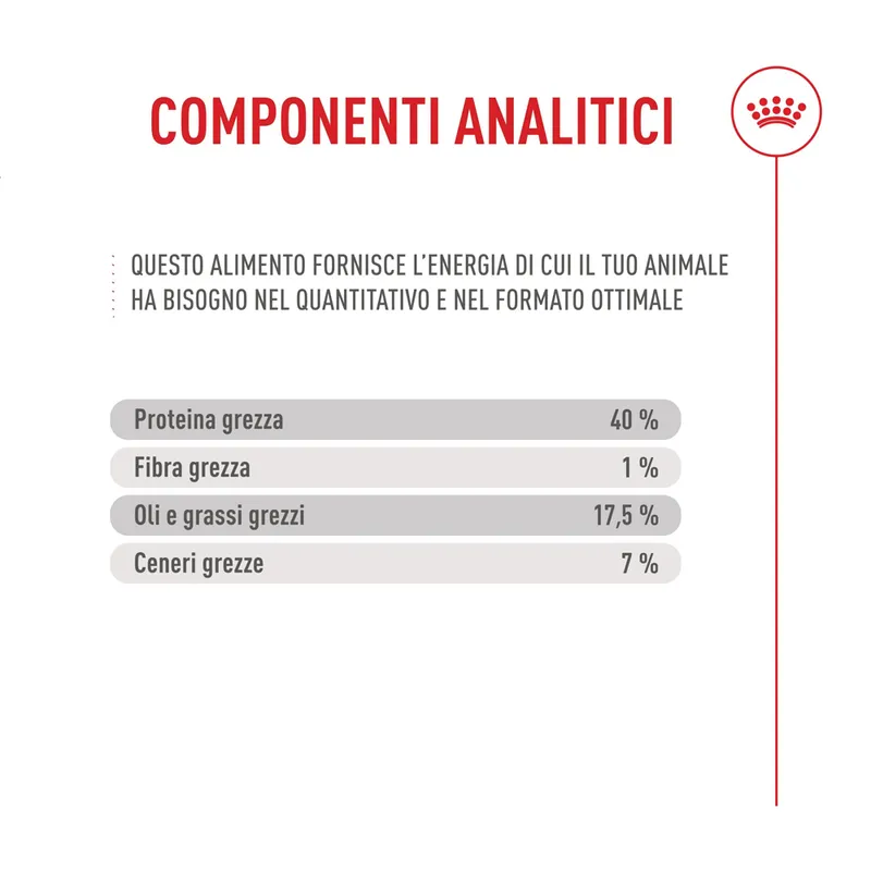 - alta densità energetica: per coprire perfettamente il fabbisogno nutrizionale del tuo pet