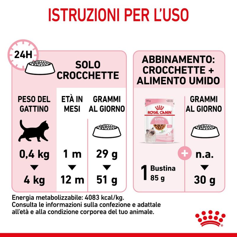 Le crocchette Royal Canin Kitten sono un cibo secco completo che nutre in maniera ottimale i gattini nella seconda fase della crescita (fino a 12 mesi di et?) che hanno un elevato fabbisogno energetico, proteico, di sostanze minerali oligoelementi e vitamine.