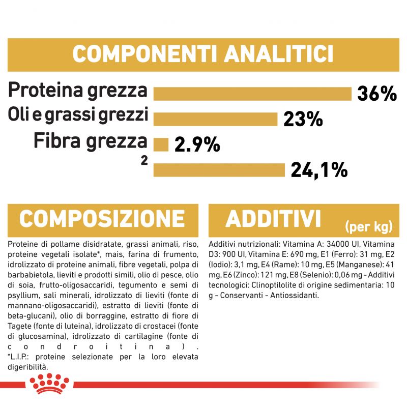 proteina di di pollame (disidratata), grasso animale, riso, isolato di proteine vegetali*, mais, farina foraggera di frumento, proteine animali (idrolizzato), lignocellulosa, polpa di barbabietola, lievito e derivati, olio di pesce, olio di soia, frutto-oligosaccaridi, Psyllium (semi e tegumenti), sali minerali, idrolizzato di lievito (fonte di mannano-oligosaccaridi), estratto di lievito (fonte di beta-glucani), olio di borragine, estratto di fiori di Tagetes (fonte di luteina), idrolizzato di crostacei (fonte di glucosammina), idrolizzato di cartilagine (fonte di condroitina).