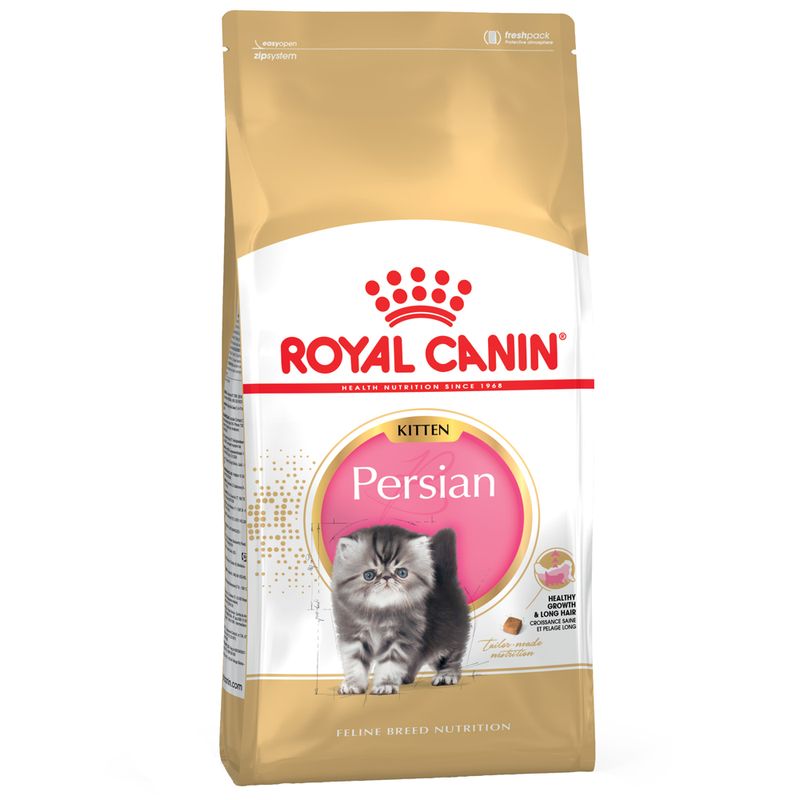 Crocchette specifiche per gatti Persiani in fase di crescita (4-12 mesi), con formula nutrizionale esclusiva, per la riduzione delle sostanze di scarto e FOS per l'equilibrio della flora intestinale.