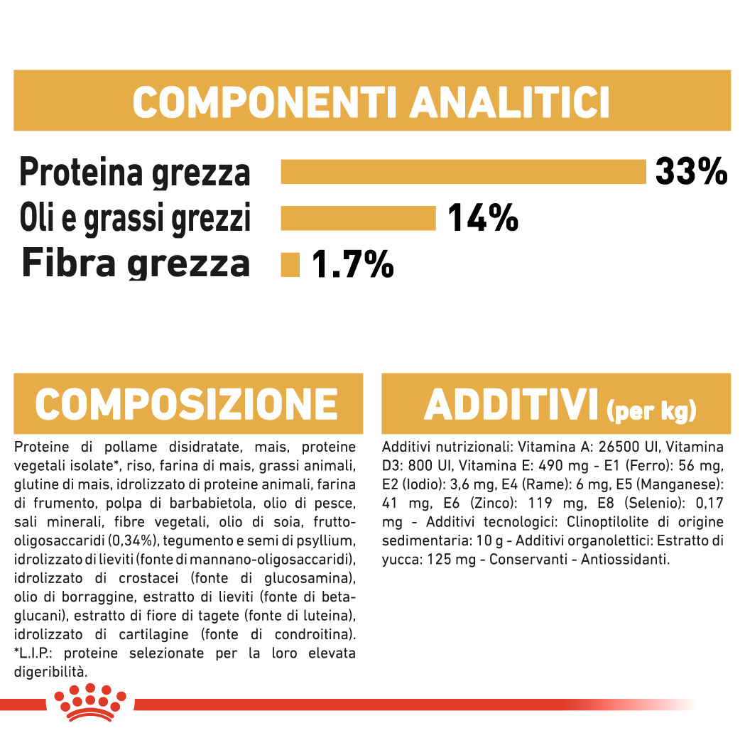 Ingredienti: riso, proteina di pollame (disisdratata), isolato di proteine vegetali*, mais, grasso di origine animale, glutine di mais, proteine di origine animale (idrolizzato), minerali, olio di pesce, fibre vegetali, olio di soia, polpa essiccata di barbabietola, frutto-oligosaccaridi, semi e tegumenti di Psyllium, idrolizzato di lievito (fonte di mannano-oligosaccaridi), idrolizzato di crostacei (ricco di glucosammina), estratto di fiori di Tagetes (ricco di luteina), idrolizzato di cartilagine (ricco di condroitina), olio odi borragine.