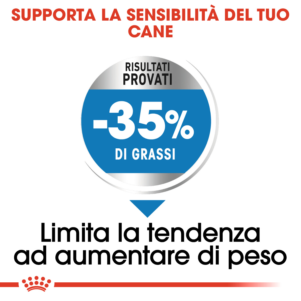 - con il 35% di grassi in meno (rispetto ad un alimento tradizionale per cani adulti): per contribuire alla perdita di peso o al mantenimento del peso forma