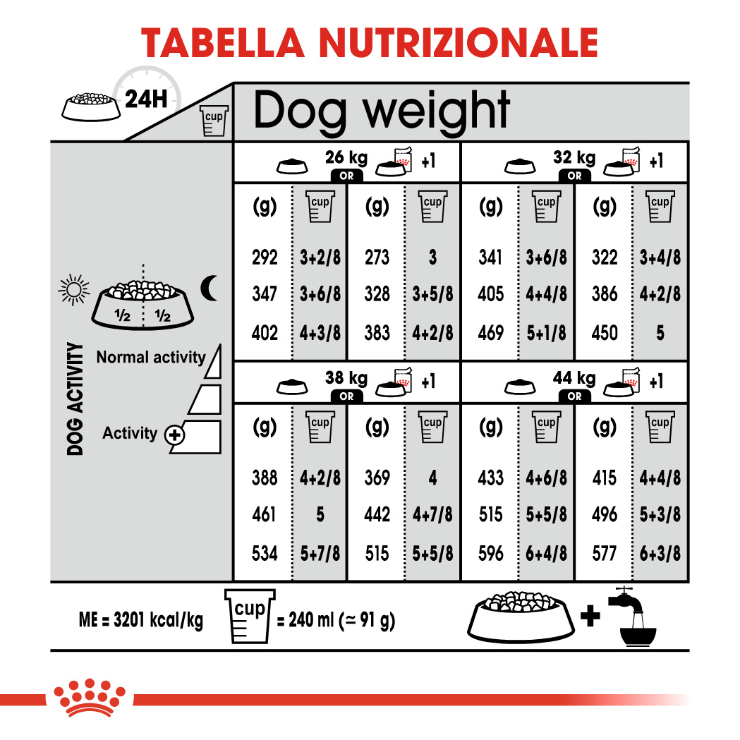 Le quantità indicate sono soltanto valori di riferimento e vanno adattate alle esigenze nutrizionali specifiche del cane.