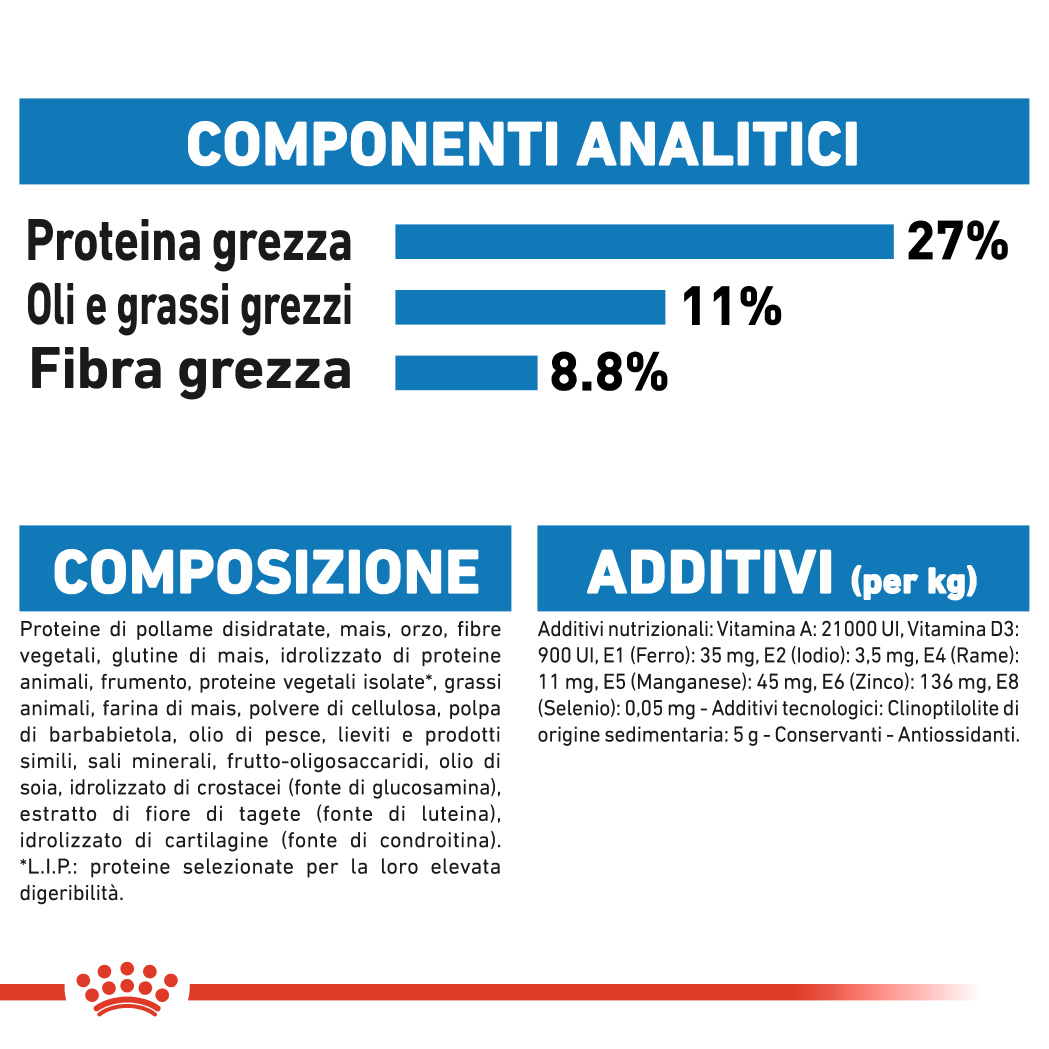 proteine di pollame disidratate, mais, orzo, fibre vegetali, glutine di mais, idrolizzato di proteine animali, frumento, proteine vegetali isolate*, grassi animali, farina di mais, polvere di cellulosa, polpa di barbabietola, olio di pesce, lieviti e prodotti simili, sali minerali, frutto-oligosaccaridi, olio di soia, idrolizzato di crostacei (fonte di glucosamina), estratto di fiore di tagete (fonte di luteina), idrolizzato di cartilagine (fonte di condroitina).
