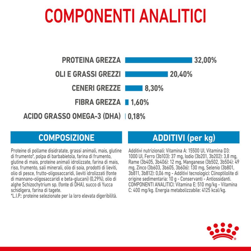 - Crescita armonica: un alto apporto energetico e un apporto proteico maggiore (32%) coprono ottimamente il fabbisogno nutrizionale della fase di crescita, durante la quale la capacità digestiva è ancora ridotta.