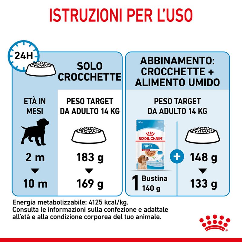 Royal Canin Medium Junior è stato sviluppato in risposta alle esigenze dei cuccioli di taglia media in fase di crescita (11 - 25 kg), a partire dai 2 mesi di vita: