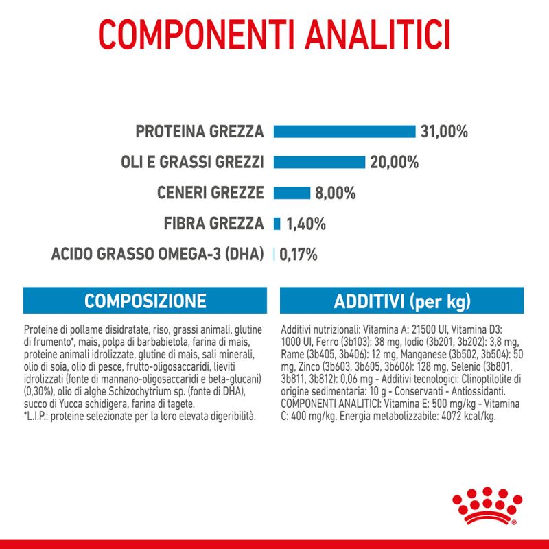 - Sicurezza digestiva: ridotto contenuto di amido, frutto-oligosaccaridi, polpa di barbabietola, mannano-oligosaccaridi, EPA-DHA, minerali insolubili.
