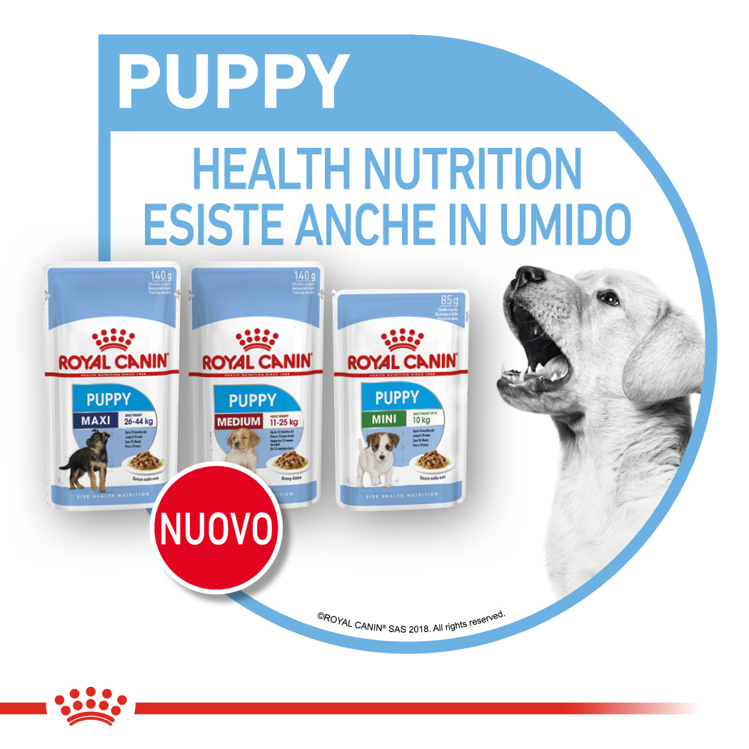 Royal Canin Mini Puppy è un cibo umido specifico per cuccioli e cani giovani di tg piccola che presentano una fase di crescita particolarmente rapida e che quindi necessitano di un' alimentazione adeguata, ricca di proteine ed energia, per accompagnare al meglio l' animale nello sviluppo. Nell' arco dei primi 10 mesi di vita i cuccioli di taglia piccola raggiungono, con un' alimentazione idonea alle loro esigenze, venti volte il loro peso corporeo iniziale. Se in questa delicata fase di crescita viene soddisfatto questo fabbisogno specifico, un cane di taglia piccola può avere un' aspettativa di vita di 13 - 16 anni.complesso di antiossidanti con vitamina E  per rafforzare le naturali difese immunitarie del vostro piccolo compagno di zampa. Grazie all' utilizzo di materie prime di altissime qualità, sottoposte a cottura delicata, questo alimento è altamente digeribile  e contribuisce all' equilibrio della flora batterica intestinale . I cuccioli fino ai 10 mesi di vita hanno un elevato fabbisogno energetico per il corretto sviluppo della muscolatura e dello scheletro. Per questo motivo hanno bisogno di circa 1,6 volte di energia in più rispetto ai cani adulti. Royal Canin Mini Puppy si contraddistingue per il suo elevato fabbisogno energetico  per fornire al vostro cucciolo di taglia piccola tutta l' energia necessaria per una crescita sana. Royal Canin Mini Puppy è confezionato in pratiche bustine di 140 g , ideali per essere somministrate come alimento completo o per arricchire la dose giornaliera di crocchette. Con Royal Canin Mini Puppy offrirete al vostro cucciolo di taglia piccola un pasto goloso e specificamente formulato per accompagnarlo al meglio nella fase di crescita.Tutte le caratteristiche di Royal Canin Mini Puppy: