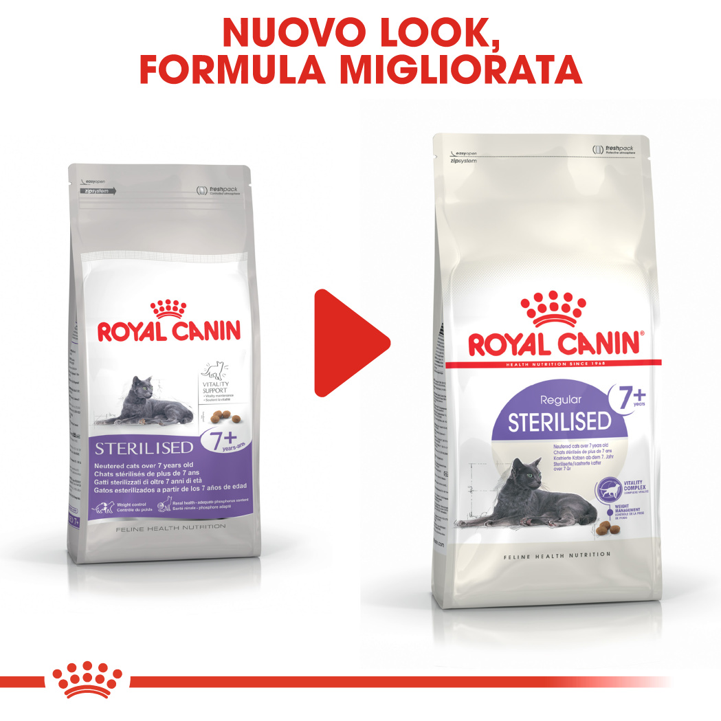 Le crocchette Royal Canin Sterilised 7+ sono state appositamente formulate per i gatti castrati con tendenza al sovrappeso: