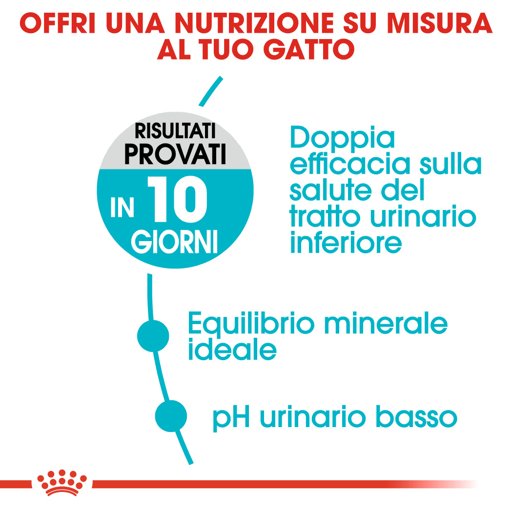 • efficacia comprovata: gli studi di Royal Canin dimostrano che URINARY CARE, se somministrato durante un arco di tempo di 10 giorni in modo esclusivo, risulta 2 volte più efficace sulle basse vie urinarie rispetto ai comuni alimenti per gatti
