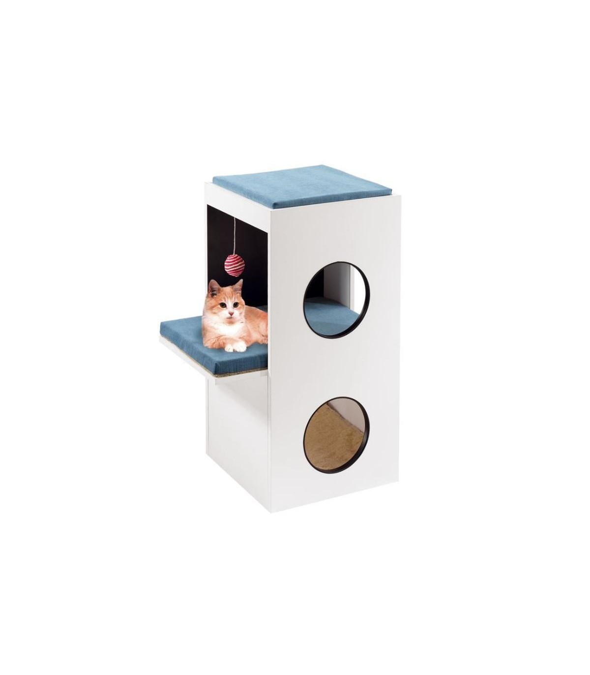 Dalla struttura verticale a torre, questo mobile per gatti saprà offrire al vostro amico un riparo accogliente consentendo al tempo stesso di tenersi in forma. I doppi fori nella parte frontale sono stati studiati per permettere all'animale un ingresso agevole e di esercitarsi al tempo stesso a saltare all'interno. Blancoè dotato inoltre di un grande ripiano centrale con comodo cuscino double-face che potrete utilizzare secondo necessità in due diverse maniere: il caldo lato in peluche durante la stagione fredda, quello in tessutoè ideale nel periodo più caldo. Nella parte alta, il mobile presenta una comoda piattaforma, ideale per gli appostamenti e per permettere al vostro gatto di tenere sotto controllo l'ambiente circostante; un divertente gioco a forma di palla in sisal assicurerà al vostro amico tanti momenti di divertimento. Tutti i cuscini sono idrorepellenti, pratici e di facile manutenzione.