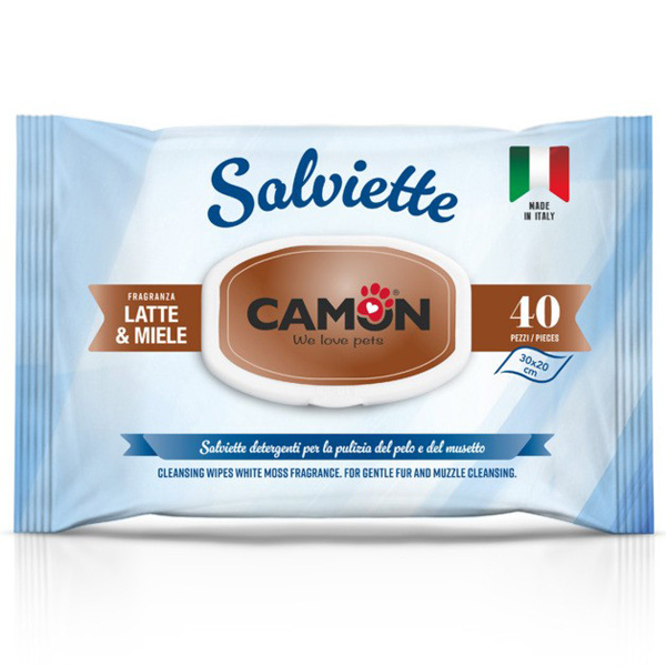 Praticissime salviette detergenti per il vostro animale domestico, da tenere sempre a portata di mano: a casa e in viaggio, per pulire il pelo e le zampe, togliere il cattivo odore, pulire il muso e le orecchie.