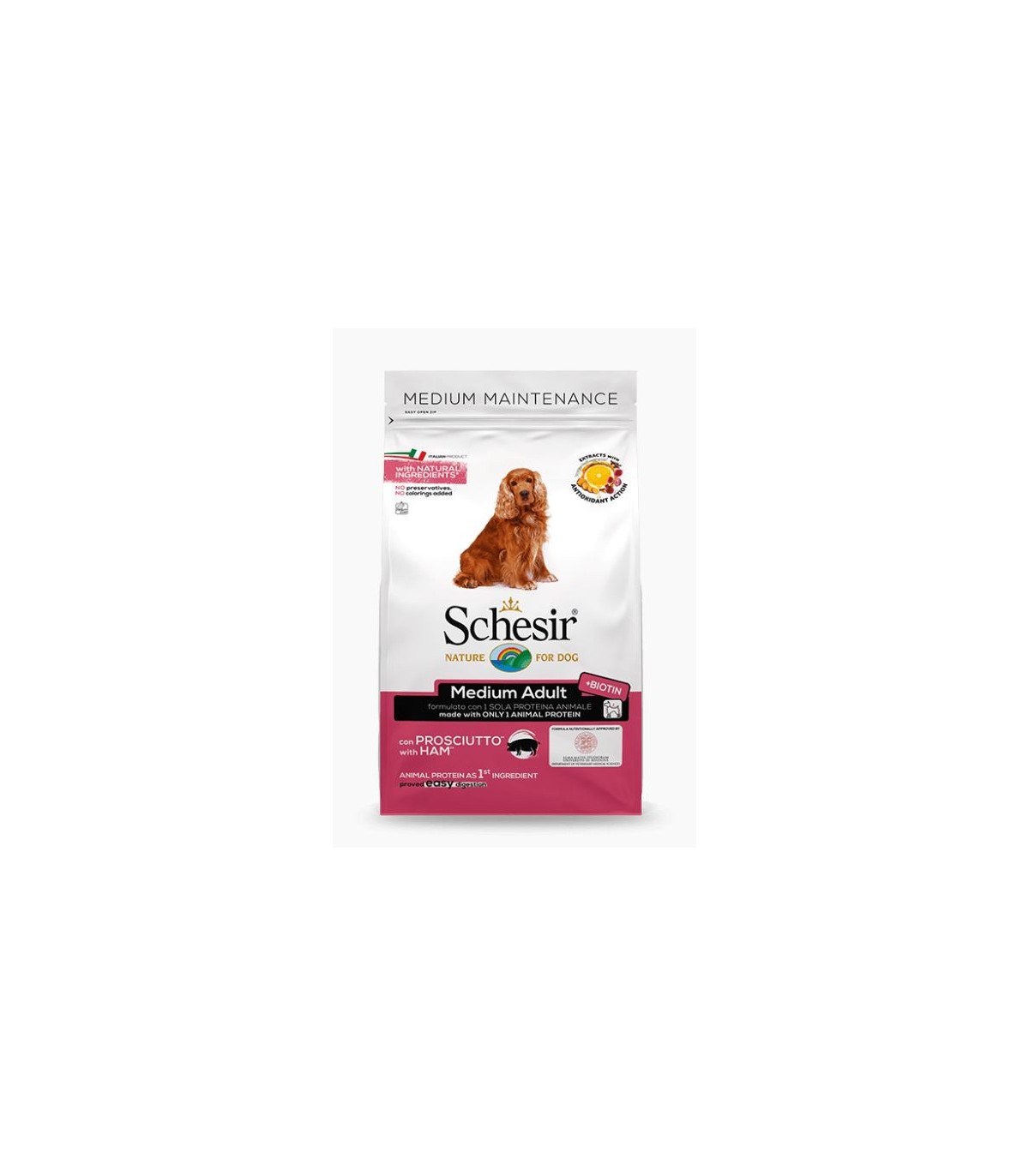 Una ricetta Schesir che ha come unica fonte proteica animale della preparazione il suino (di cui 6% prosciutto): un gustoso alimento completo e bilanciato, facilmente digeribile, che soddisfa le esigenze nutrizionali dei cani adulti di taglia media, di tutte le razze. La presenza del lievito di birra e biotina per aiutare a mantenere il benessere di pelo e cute.