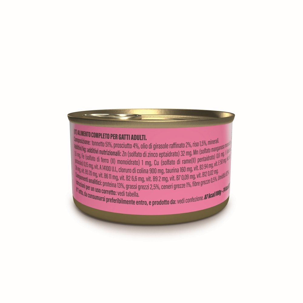 Tonnetto orientale: Euthynnus Affinis (minimo 50%), prosciutto, gelificanti vegetali (aut. CE).