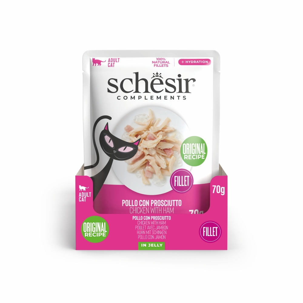 Alimento umido per gatti adulti. La ricetta Schesir è a base di veri filetti di pollo, arricchiti da gustoso prosciutto, per offrire al tuo gatto tutto il piacere delle carni migliori. La preparazione è in gelatina, per soddisfare i gusti dei gatti che prediligono un sapore naturale, ma con una consistenza più compatta nella ciotola.