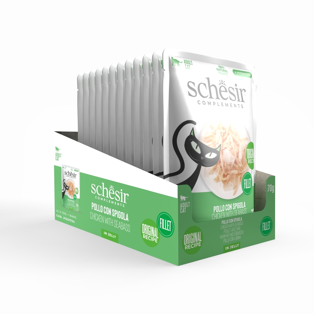 Alimento umido per gatti adulti. La ricetta Schesir è a base di veri filetti di pollo, abbinati alla spigola, pesce noto per essere ricco di proteine e di omega 3, per un invitante incontro di sapori. La preparazione è in gelatina, per soddisfare i gusti dei gatti che prediligono un sapore naturale, ma con una consistenza più compatta nella ciotola.