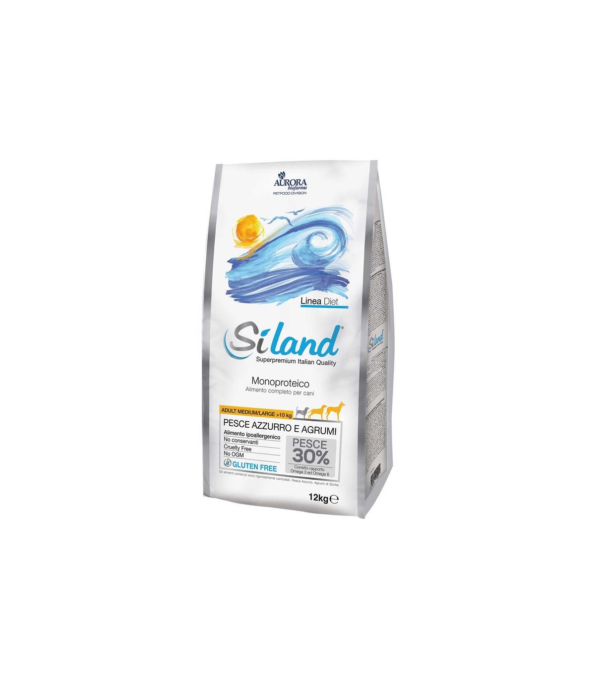 Siland cane diet adult medium large pesce azzurro e agrumi 12 kgè un alimento completo per cani con peso superiore ai 10 kg, Monoproteico, contenente PESCE AZZURRO E AGRUMI. Corretto rapporto Omega 3 ed Omega 6.