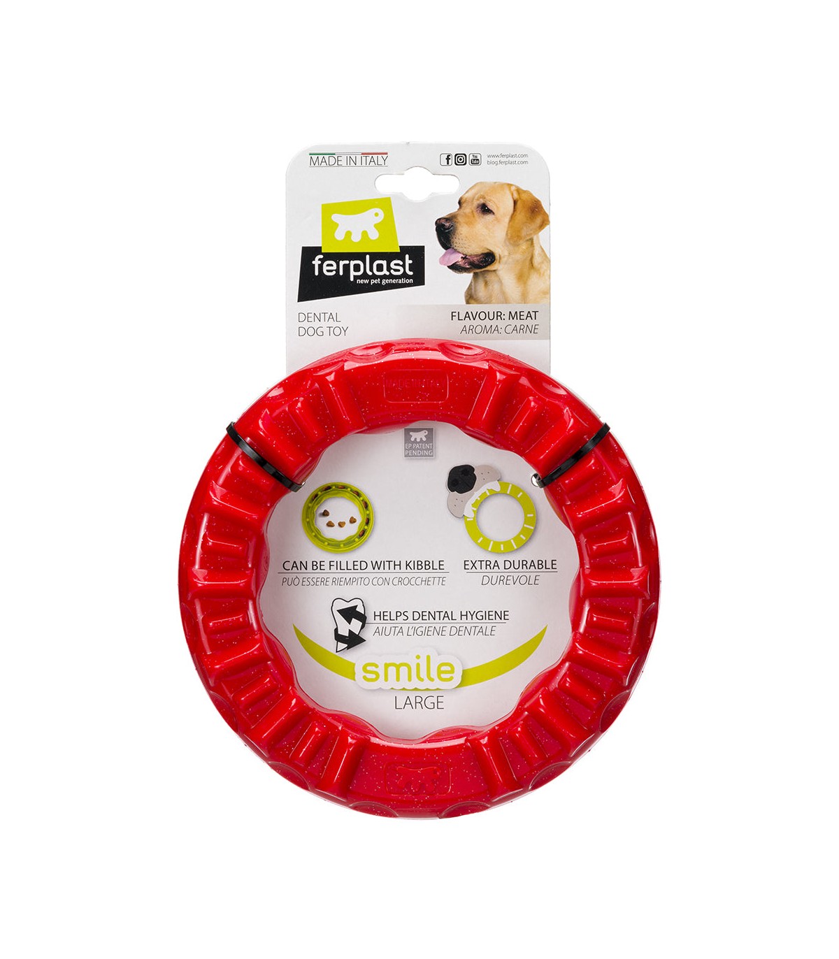 Smile di Ferplast è l'alleato perfetto per questo scopo! Questo anello gioco per cani aiuta il vostro amico nella pulizia dei denti grazie all'azione meccanica della masticazione. Addizionato di cristalli di bicarbonato, favorisce la riduzione di placca e la formazione del tartaro contribuendo così ad una perfetta igiene della bocca del vostro amico e alito più fresco. Grazie alla superficie irregolare, inoltre, tiene esercitati i muscoli della bocca ed effettua un piacevole massaggio sulle gengive del cane. Può essere riempito con squisite crocchette per incentivare l'interesse di Fido, promuovere gioco e divertimento. E' perfetto come gioco da riporto oppure per giocare a tira e molla. Grazie all'aroma carne, infine, risulta attraente per il quattrozampe.