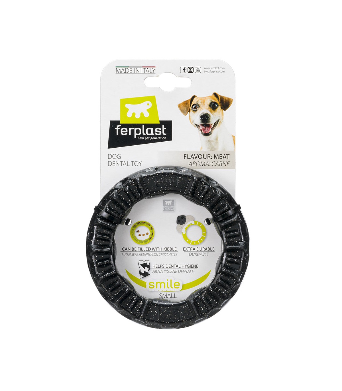 Smile di Ferplast è l'alleato perfetto per questo scopo! Questo anello gioco per cani aiuta il vostro amico nella pulizia dei denti grazie all'azione meccanica della masticazione. Addizionato di cristalli di bicarbonato, favorisce la riduzione di placca e la formazione del tartaro contribuendo così ad una perfetta igiene della bocca del vostro amico e alito più fresco. Grazie alla superficie irregolare, inoltre, tiene esercitati i muscoli della bocca ed effettua un piacevole massaggio sulle gengive del cane. Può essere riempito con squisite crocchette per incentivare l'interesse di Fido, promuovere gioco e divertimento. E' perfetto come gioco da riporto oppure per giocare a tira e molla. Grazie all'aroma carne, infine, risulta attraente per il quattrozampe.