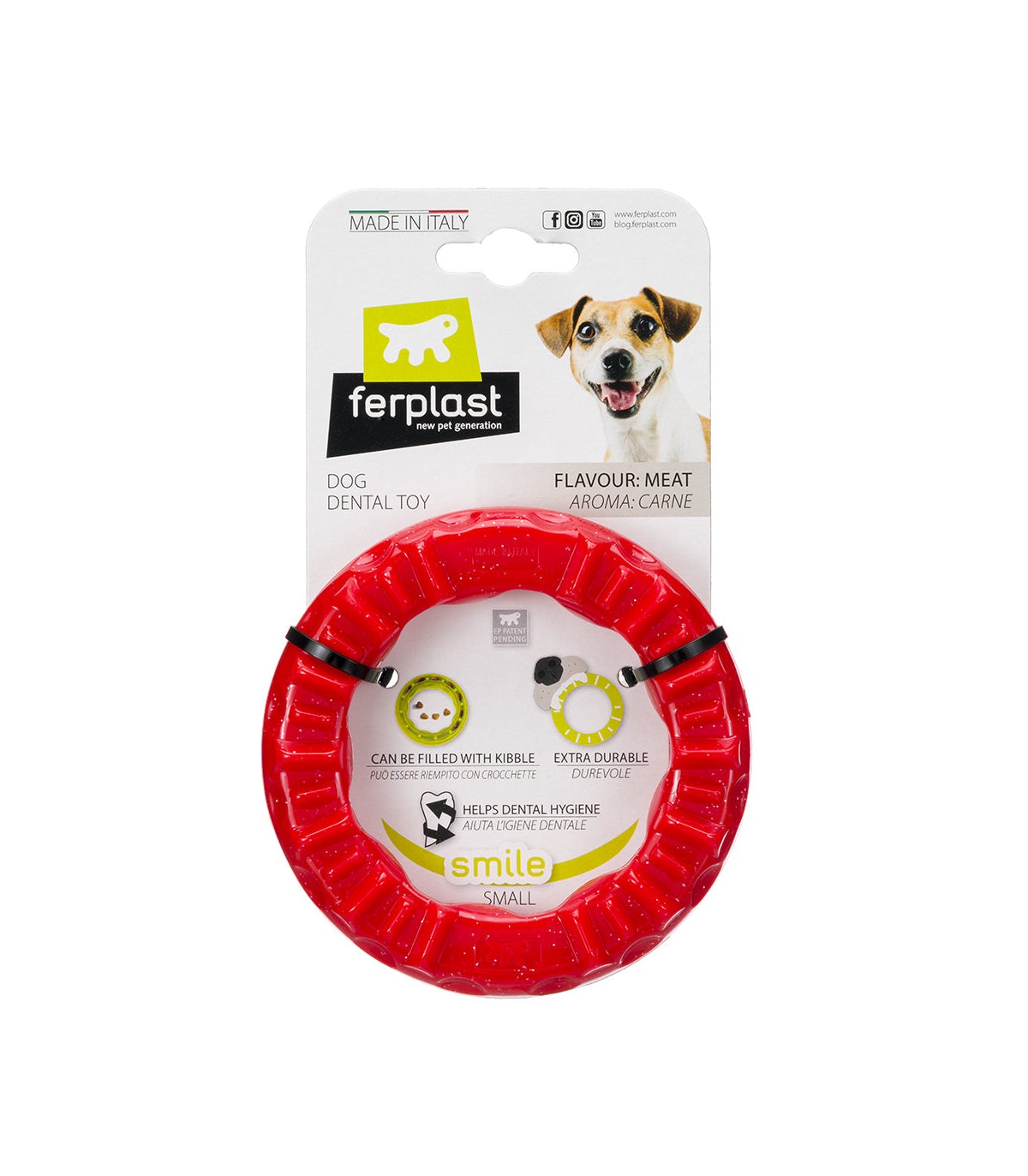 Smile di Ferplastè l'alleato perfetto per questo scopo! Questo anello gioco per cani aiuta il vostro amico nella pulizia dei denti grazie all'azione meccanica della masticazione. Addizionato di cristalli di bicarbonato, favorisce la riduzione di placca e la formazione del tartaro contribuendo così ad una perfetta igiene della bocca del vostro amico e alito più fresco. Grazie alla superficie irregolare, inoltre, tiene esercitati i muscoli della bocca ed effettua un piacevole massaggio sulle gengive del cane. Può essere riempito con squisite crocchette per incentivare l'interesse di Fido, promuovere gioco e divertimento. E' perfetto come gioco da riporto oppure per giocare a tira e molla. Grazie all'aroma carne, infine, risulta attraente per il quattrozampe.