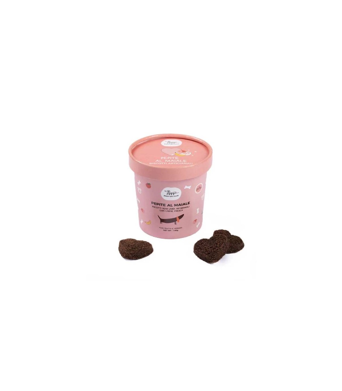 Le nostre pepite al maiale sono dei biscotti monoproteici adatti anche per gli amici a quattro zampe con sensibilità digestive. Fatte come in casa, utilizzando solo carne fresca di origine italiana (e non farine), risultano prive di qualsiasi cereale e carboidrati complessi. Prive di appetizzanti, conservanti o coloranti artificiali, il prodotto viene lavorato in maniera artigianale a freddo ed essiccato a bassa temperatura, in modo da mantenere inalterati i principi nutrizionali dei suoi ingredienti e garantire una elevata digeribilità