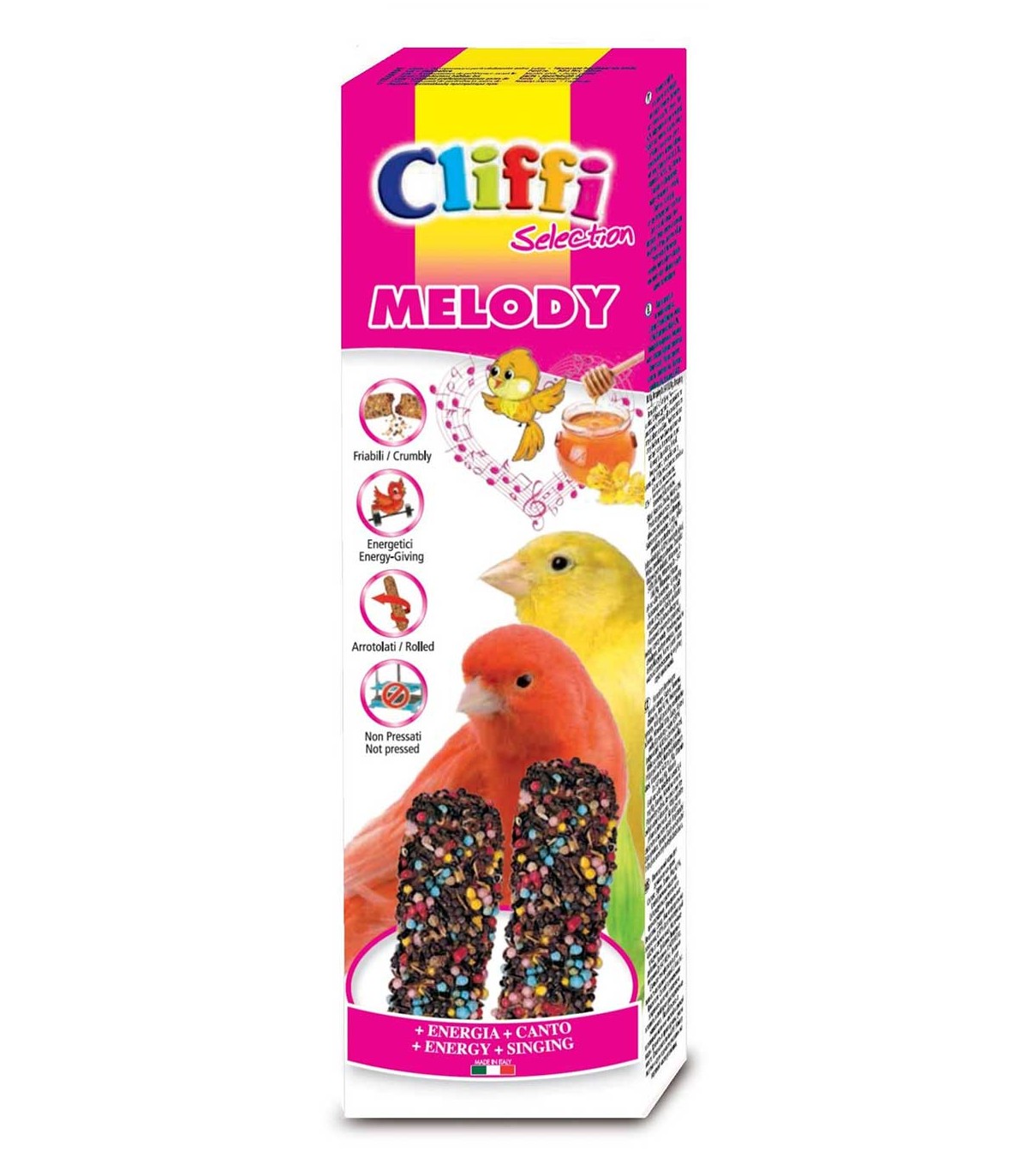 Caratteristiche: Gli STICKS sono importanti per i canarini, perché oltre a fornire le sostanze nutritive necessarie per una corretta alimentazione, lo inducono ad alimentarsi, staccando i semi, come in natura, consentendogli di attuare tutti quei comportamenti che sono utili per il mantenimento di un buon equilibrio psico-fisico. Gli STICKS CLIFFI "MELODY" sono a base di semi naturalmente ricchi di sostanze energetiche particolarmente indicate per stimolare e mantenere in piena attività le capacità canore dei canarini.