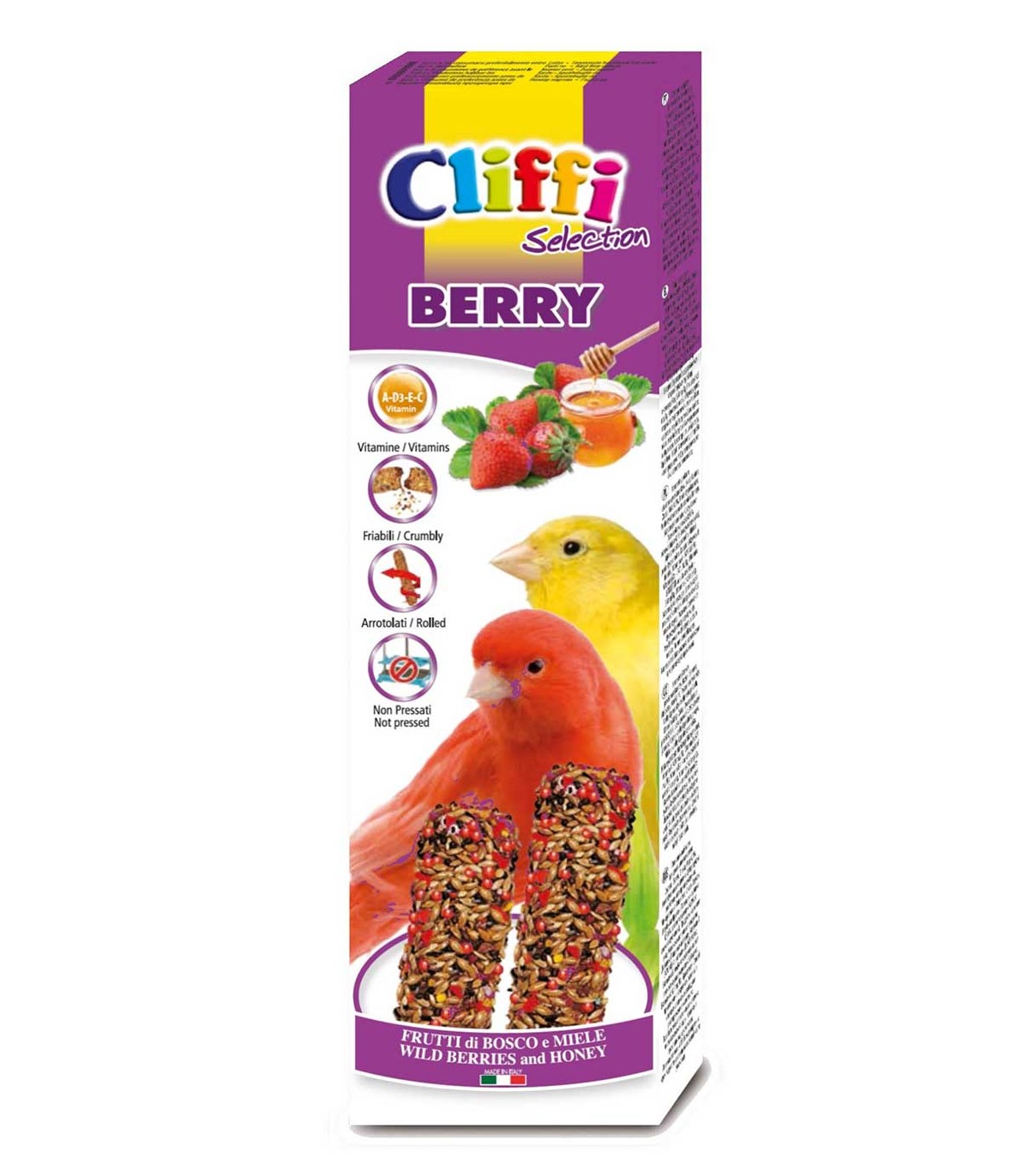 Gli STICKS sono importanti per i canarini, perché oltre a fornire le sostanze nutritive necessarie per una corretta alimentazione, lo inducono ad alimentarsi, staccando i semi, come in natura, consentendogli di attuare tutti quei comportamenti che sono utili per il mantenimento di un buon equilibrio psico-fisico. Gli STICKS CLIFFI "BERRY" con FRUTTI DI BOSCO e MIELE sono particolarmente graditi e apprezzati dai canarini che ritrovano gli stessi frutti rossi della natura, ricchi di vitamina C antiossidante