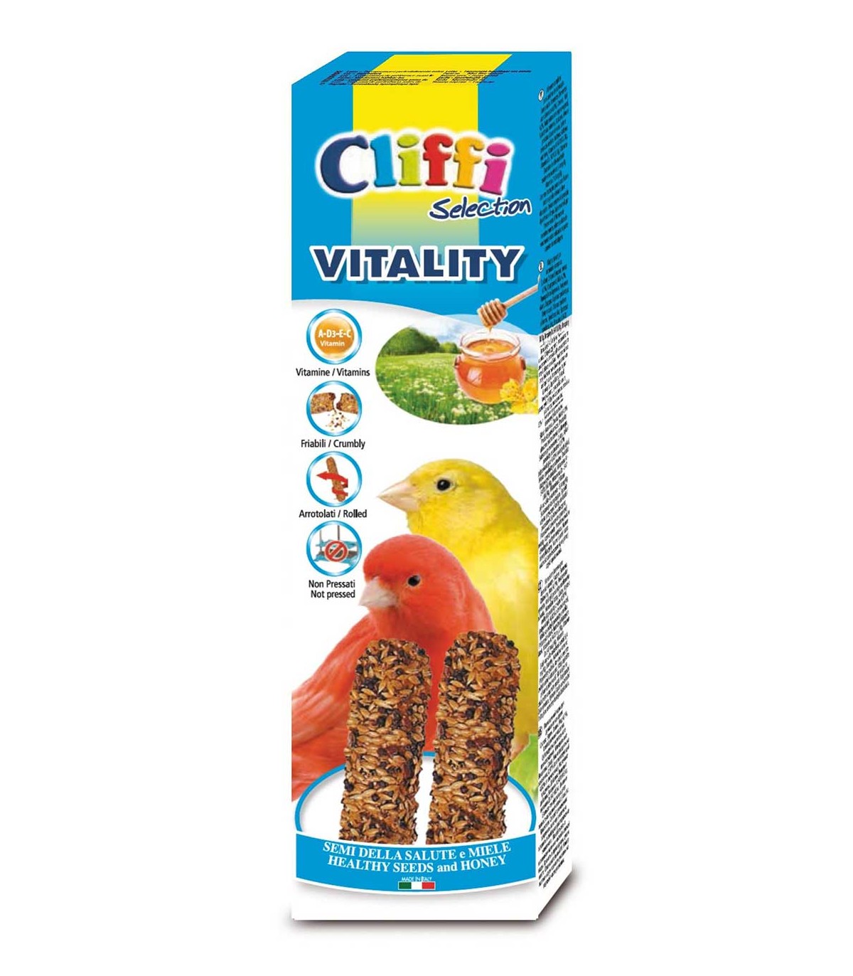 Caratteristiche: Gli STICKS sono importanti per i canarini, perché oltre a fornire le sostanze nutritive necessarie per una corretta alimentazione, lo inducono ad alimentarsi, staccando i semi, come in natura, consentendogli di attuare tutti quei comportamenti che sono utili per il mantenimento di un buon equilibrio psico-fisico. Gli STICKS CLIFFI "VITALITY" con SEMI DELLA SALUTE e MIELE sono costituiti da quei semi che i canarini ricercano, in natura, per le loro benefiche proprietà depurative, disintossicanti e regolatrici del metabolismo, forniscono inoltre, tutta l'energia e le benefiche proprietà del miele.