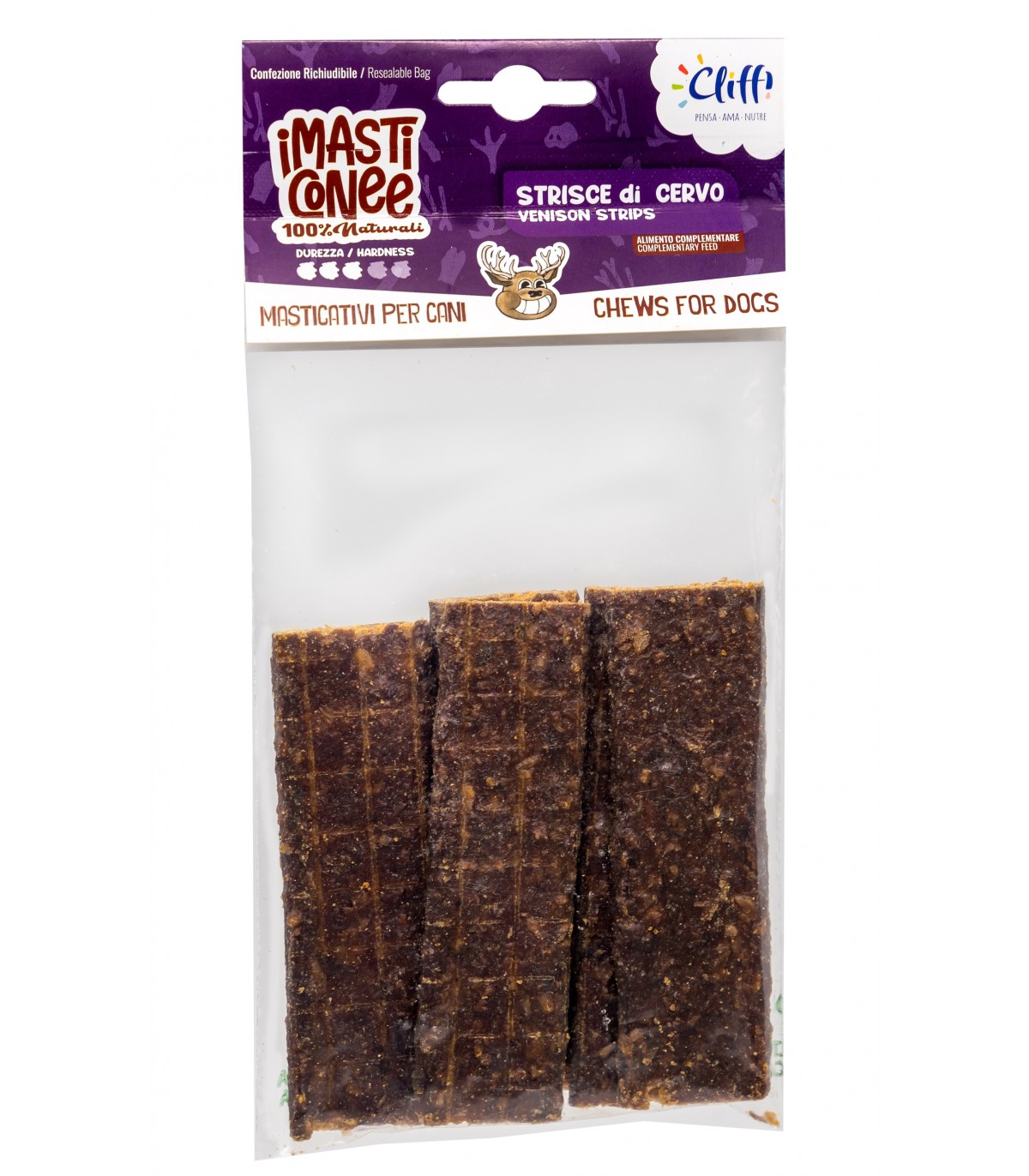 COMPOSIZIONE: Carne di cervo essiccata. 100% Cervo. Non contiene additivi.