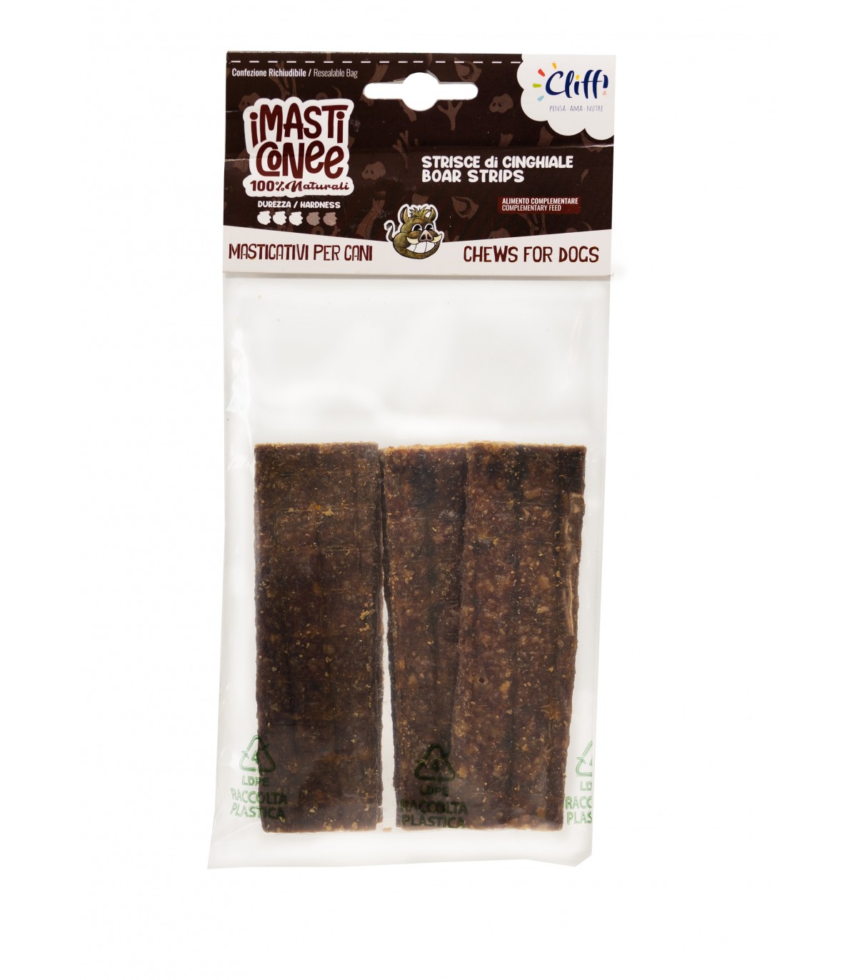 COMPOSIZIONE: Carne di cinghiale essiccata. 100% Cinghiale. Non contiene additivi.