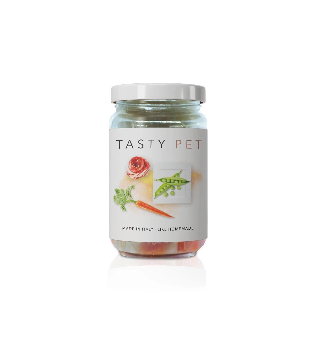 Pollo e fegato di pollo 50%, maiale 10%, carote, piselli. amido, brodo di cottura.