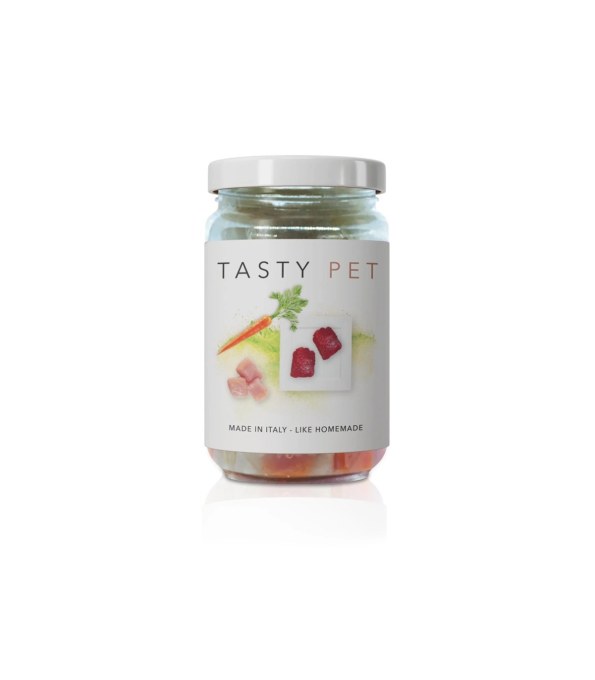 Pollo e fegato di pollo 50%, maiale 10%, carote 4%, piselli 4%, sorbato di potassio, gomma di guar, amido, brodo di cottura.