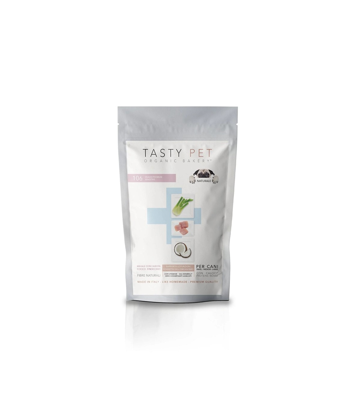 \xc3\x89 uno Snack Naturale monoproteico a basso contenuto calorico adatto a tutti i tipi di cane, adulti e cuccioli. \xc3\x89 composto da ingredienti naturali che apportano il giusto contributo di potassio, ferro, calcio, fosforo, indispensabili per mantenere in salute tutto l'organismo. La presenza di Omega 3 e 6, antiossidanti naturali, lo rende ottimo per l'apparato cardiovascolare. Inoltreè ricco di vitamine A-B-C-D-E che aiutano a migliorare il sistema immunitario, rafforzando anche ossa e denti. I sali minerali e le fibre vegetali svolgono un'azione depurativa e digestiva, migliorando la funzionalità intestinale. Contiene erba medica cheè una pianta molto benefica, perché aiuta a smaltire le tossine accumulate. \xc3\x89 uno snack detossinante a basso contenuto calorico, ideale per mantenere il peso forma del cane.