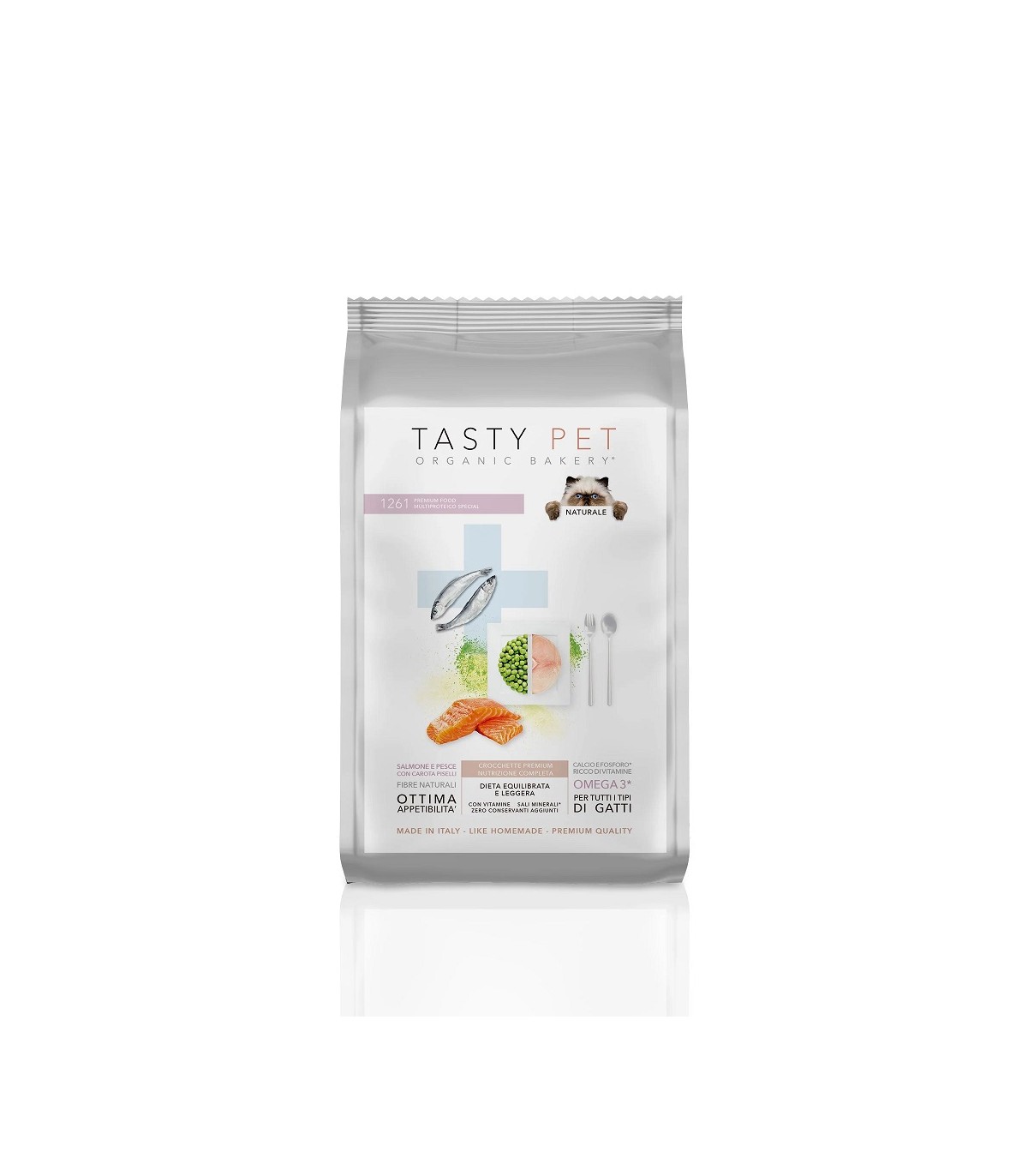Salmone e pesce azzurro 40%, piselli, polpa di barbabietole, proteine idrolizzate di pollo, strutto di maiale, mais integrale, frumento, riso, lievito di birra disidratato, taurina, M.O.S, sostanze minerali.