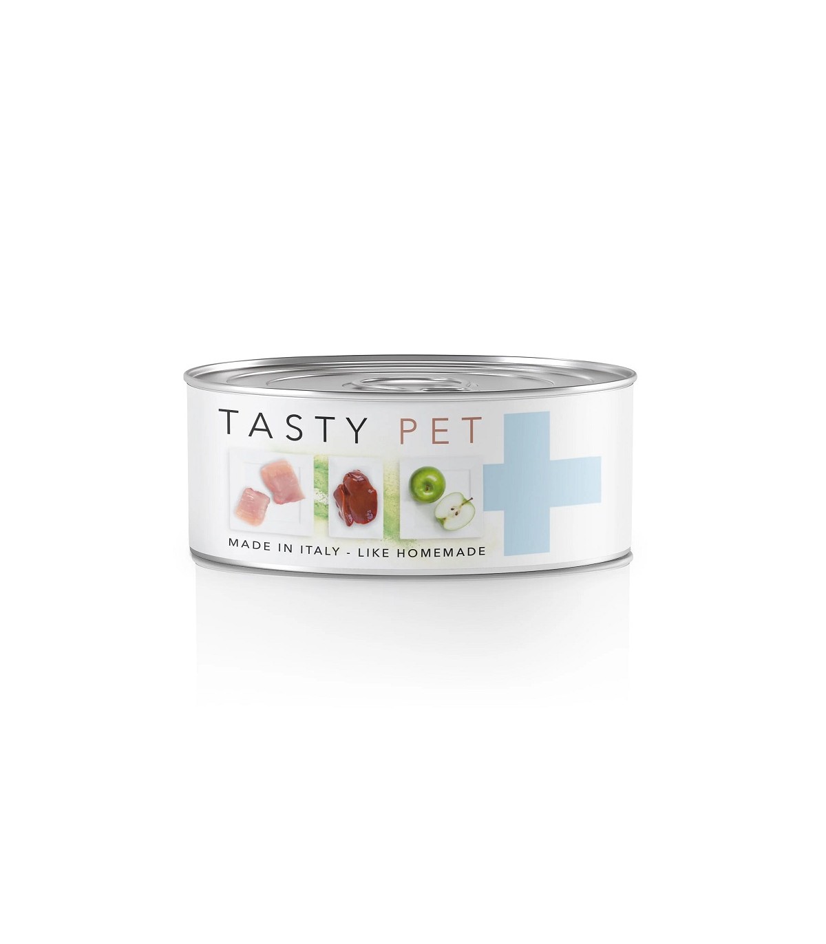 Pollo 27%, fegato di pollo 27%, mela 4%, carote 4%, amido, taurina, brodo di cottura.