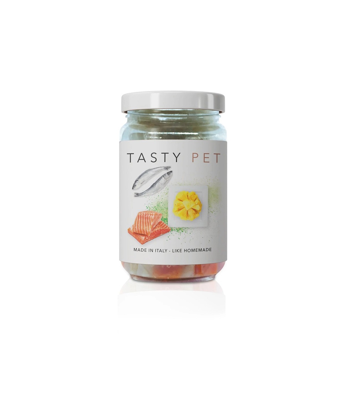 Salmone, pesce azzurro e surimi 59%, carote 4%, ananas 4%, amido, gomma di guar, sorbato di potassio, brodo di cottura.