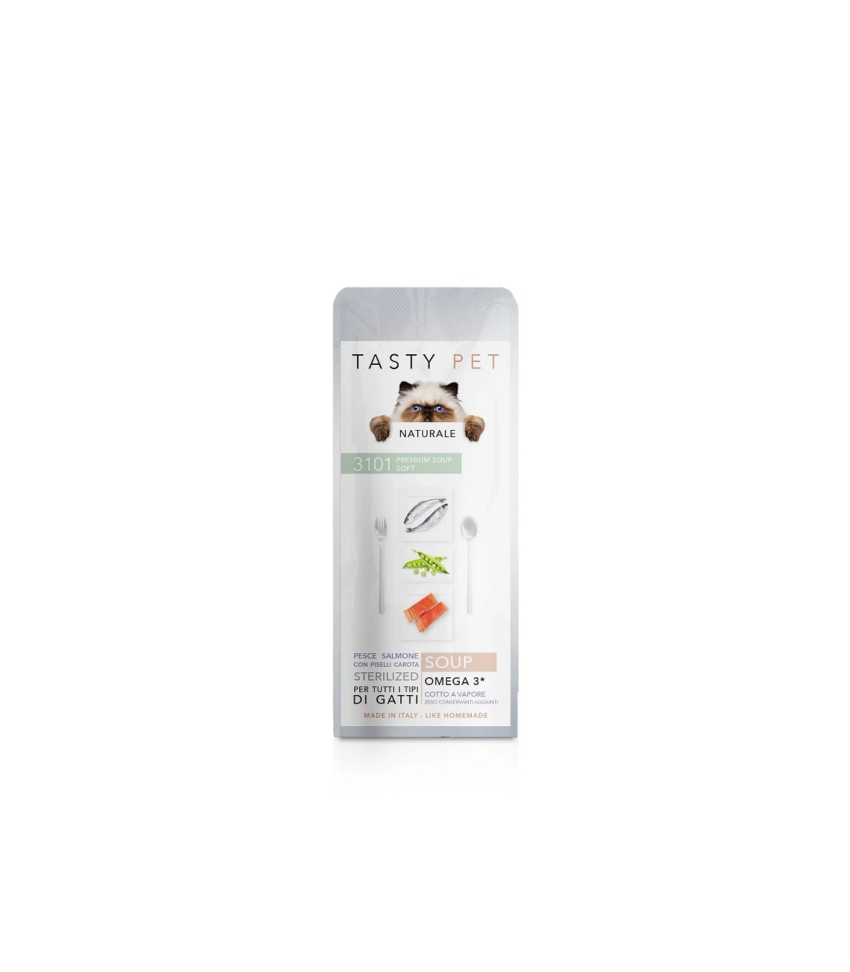 \xc3\x89 composto da ingredienti naturali ricchi di Omega 3 utili per il benessere del gatto perchè aiutano e rafforzano il sistema cardiovascolare. Contiene la vitamina A molto importante per la vista e le vitamine B1-B6-B9-B12 che mantengono il tono muscolare e la salute della pelle e del pelo. Questa Soupè ricca di fibre vegetali per il buon funzionamento del sistema gastrointestinale. Contiene il calcio che rinforza ossa e denti, magnesio, zinco e sodio per il corretto funzionamento dei reni. \xc3\x89 un prodotto nutriente, ricco di proteine magre che aiutano a mantenere il peso forma.